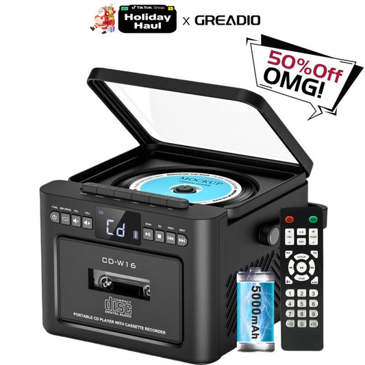 Greadio 9-In-1 Rechargeable CD Boombox with Cassette, Bluetooth, FM Radio, USB/TF/AUX, 5000Mah Battery, Remote Control, for Home & Outdoor Use Audio